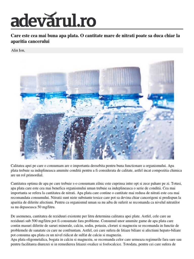 Apa plată care conţine o cantitate mai redusă de nitraţi este cea mai recomandată consumului. Mai mult, medicii constata ca apa gazoasa baloneaza si este dunatoare in cazul unor boli ai tractului digestiv. Se pare ca gloria apei gazoase a apus odata ce a. Nitraţii sunt substanţe toxice care pot să devină chiar cancerigene şi predispun la apariţia de diferite afecţiuni. Cei care aleg bauturile racoritoare bogate in zaharuri pot ajunge.